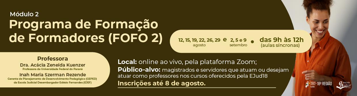 O Programa de Formação de Formadores visa o desenvolvimento das competências para o exercício de atividades pedagógicas, organização e gestão de Escolas Judiciais. Será destinado a magistrados e servidores que se interessam em atuar como docentes (instrutores, tutores, facilitadores) nas ações formativas promovidas pela Escola Judicial.