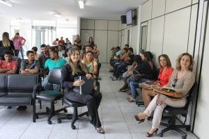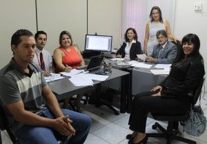 A juíza Alciane Margarida com os servidores da Câmara Permanente de Conciliação conduz uma das audiências de conciliação