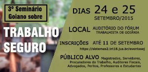 A abertura oficial do 3º Seminário Goiano sobre Trabalho Seguro, promovido pelo TRT de Goiás com apoio da Pontifícia Universidade Católica de Goiás (PUC-Goiás), acontece nesta quinta-feira, 24/9, às 10 horas, no auditório do Fórum Trabalhista de Goiânia. O gestor regional do Programa Trabalho Seguro, desembargador Eugênio José Cesário Rosa, ressaltou que o Brasil é o quarto país em número de acidentes do trabalho e o objetivo do seminário é contribuir para modificar essa realidade brasileira tão adversa. “O seminário deste ano vai tratar das novas tecnologias e novos riscos, a importância do nexo epidemiológico e o impacto dos agrotóxicos na saúde do trabalhador, dentre outros temas”, destacou.