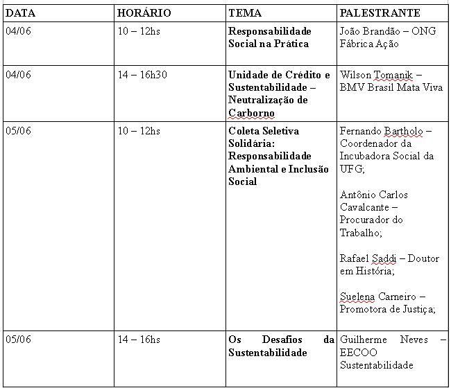 Na programação estão previstas quatro palestras que abordarão os desafios da sustentabilidade no século XXI, tratadas por representantes de organizações que lidam diretamente com o tema. O evento é aberto a magistrados, servidores, estudantes, profissionais e ao público em geral. O interessado deve fazer inscrição prévia pelo site www.trt18.jus.br/ead, para posterior emissão de certificado de participação e contagem do adicional de qualificação.