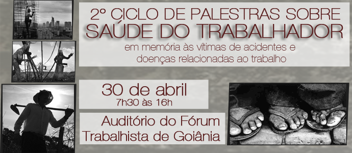 Estão abertas as inscrições para o segundo Ciclo de Palestras em Saúde do Trabalhador – em memória às vítimas de acidentes e doenças relacionadas ao trabalho, uma promoção conjunta do TRT-GO e do Centro de Referência em Saúde do Trabalhador de Goiás (CEREST). O evento acontece no próximo dia 30, das 7h30 às 16h, no Auditório do Fórum Trabalhista de Goiânia. As inscrições podem ser feitas pelo email cerest.goias@hotmail.com ou pelo fone (62) 3201-4556.