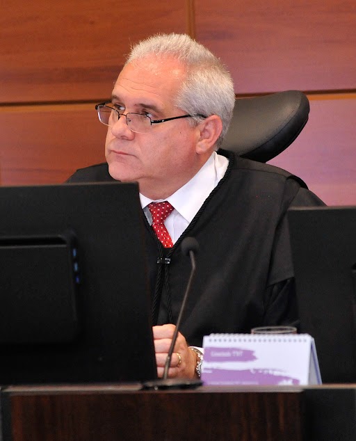A imagem retrata um homem de meia-idade, com cabelos curtos e grisalhos, sentado em uma mesa de madeira. Ele usa óculos de grau e veste uma toga preta sobre uma camisa branca e gravata vermelha com pequenos pontos brancos.