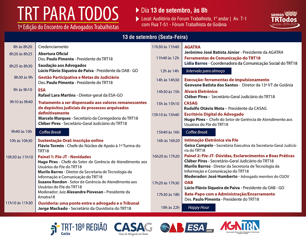 As atividades TRT para Todos para advogados serão iniciadas às 8 horas, com o credenciamento seguido da abertura do encontro às 8h20. Após o intervalo para almoço, que será das 12 às 14 horas, as palestras continuam no período vespertino, encerrando-se às 18 horas, com um happy hour. Veja mais na programação abaixo.