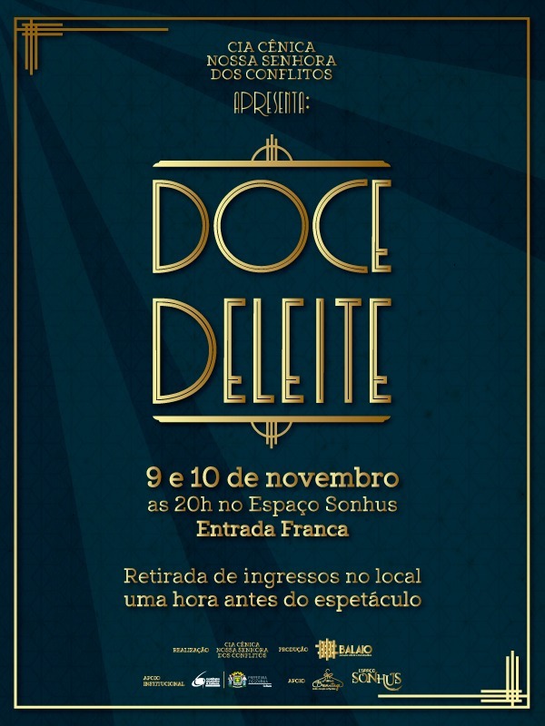 Uma comédia que resgata o humor ao estilo do Teatro de Revista. Assim é “Doce Deleite”, peça da Companhia Nossa Senhora dos Conflitos, que estreia nos dias 9 e 10/11 no Espaço Sonhus, no Colégio Lyceu de Goiânia, às 20 horas com entrada franca.