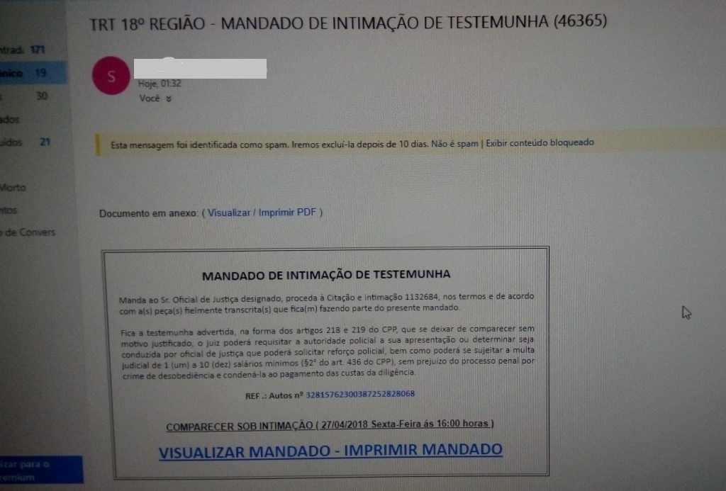 As falsas mensagens que chegam para usuários externos como se fossem da Justiça do Trabalho tratam do comparecimento em audiência de testemunha ou de outros assuntos. Portanto, se você receber algum e-mail nesse sentido, saiba que o TRT18 não envia intimação trabalhista por correio eletrônico.