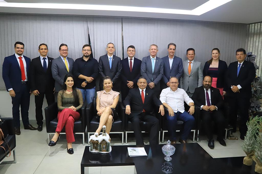 Foto mostra representantes da advocacia de Anápolis, homens e mulheres, com o presidente do TRT-18 e servidores. A maioria está em pé, lado a lado, atrás, enquanto outros estão sentados, à frente