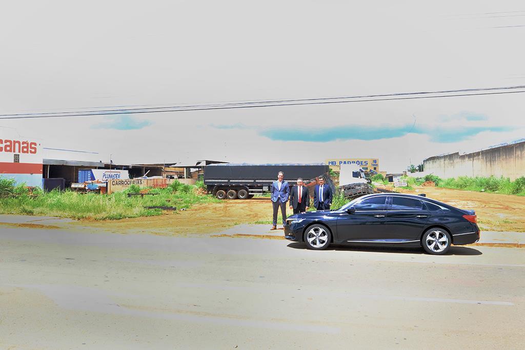 Foto mostra o presidente, o diretor-geral e o secretário-geral da Presidência do TRT-18 em pé, lado a lado, diante do terreno doado para a construção da nova sede do Foro Trabalhista de Anápolis. Ao fundo, um caminhão estacionado no lote e, em primeiro plano, um carro preto estacionado na rua