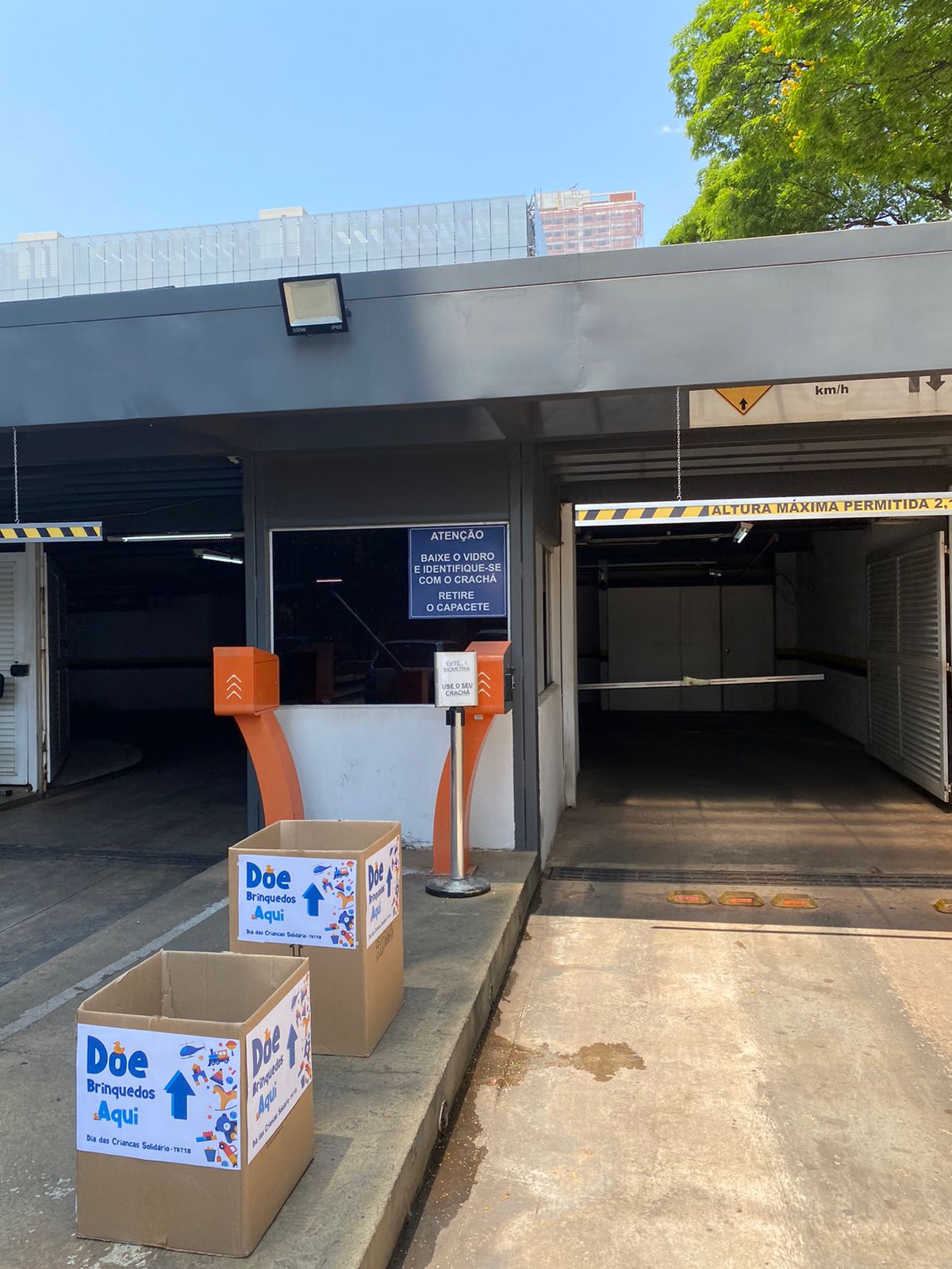 Caixas coletoras na entrada do estacionamento do Fórum Trabalhista, na Rua T-51 esquina com T-29, no Setor Bueno