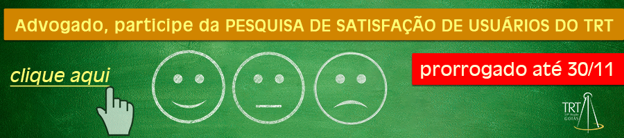 A 8ª Pesquisa de Satisfação de Usuários, dirigida a advogados, empregadores e trabalhadores poderá ser respondida até a próxima sexta-feira, 30/11. O objetivo é ouvir a opinião dos jurisdicionados e profissionais que atuam na Justiça do Trabalho de Goiás para que possamos aprimorar o atendimento e a qualidade dos serviços prestados.
