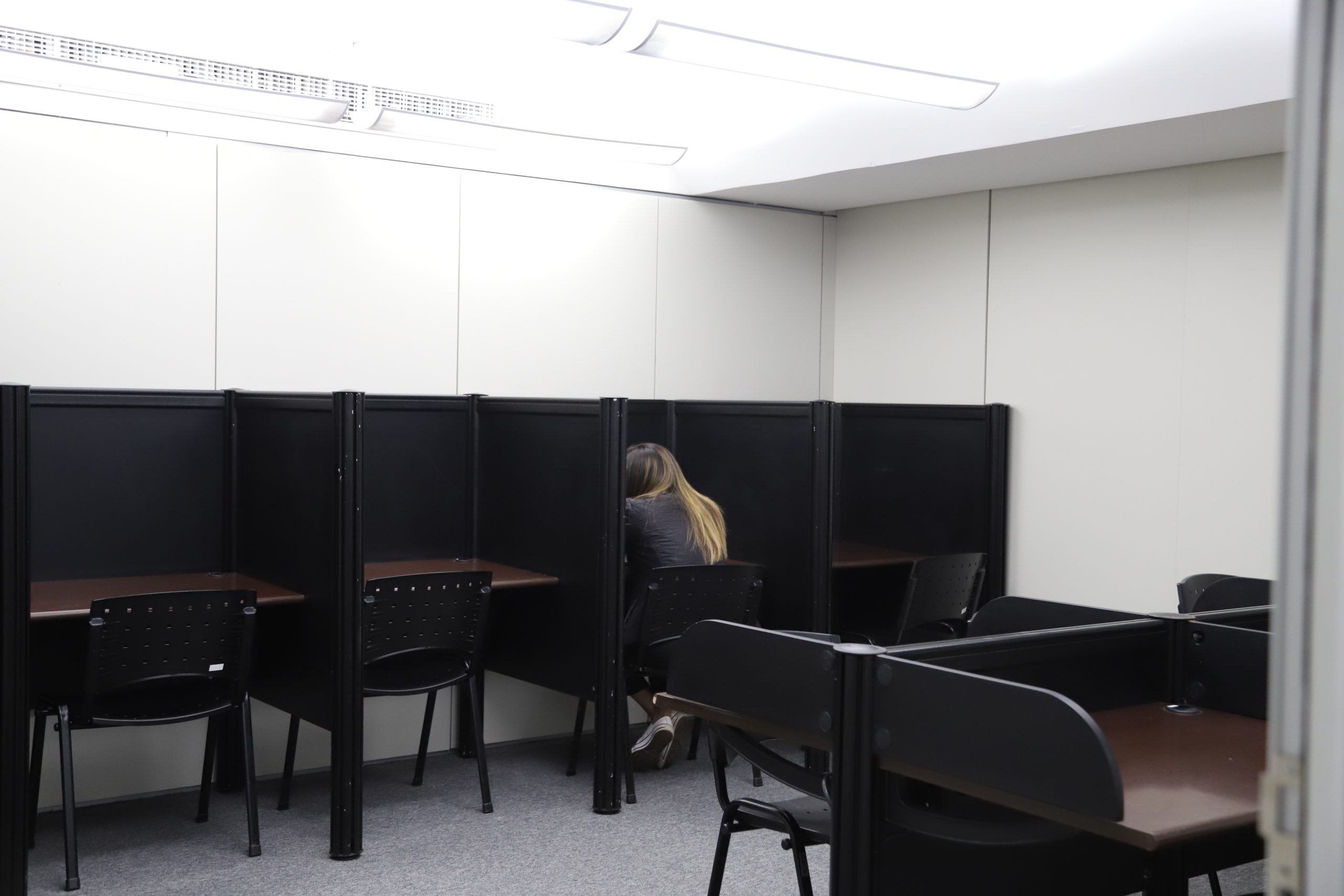 A imagem é de uma sala de estudos com uma atmosfera mais reservada. Há cabines de estudo individuais alinhadas, cada uma com uma cadeira e uma mesa pequena. Uma pessoa com cabelo loiro está sentada em uma das cabines, de costas para a câmera, focada em seu trabalho. A iluminação é suave e o espaço parece ser destinado a estudo ou trabalho que requer concentração. Na imagem vemos a entrada de uma biblioteca, marcada por uma barreira baixa com a palavra "Biblioteca" e uma seta indicando a saída. Pode-se ver um balcão de atendimento com duas pessoas conversando e mais estantes de livros ao fundo. A iluminação é clara e a área parece bem organizada, indicando a entrada para um ambiente de estudo e leitura.