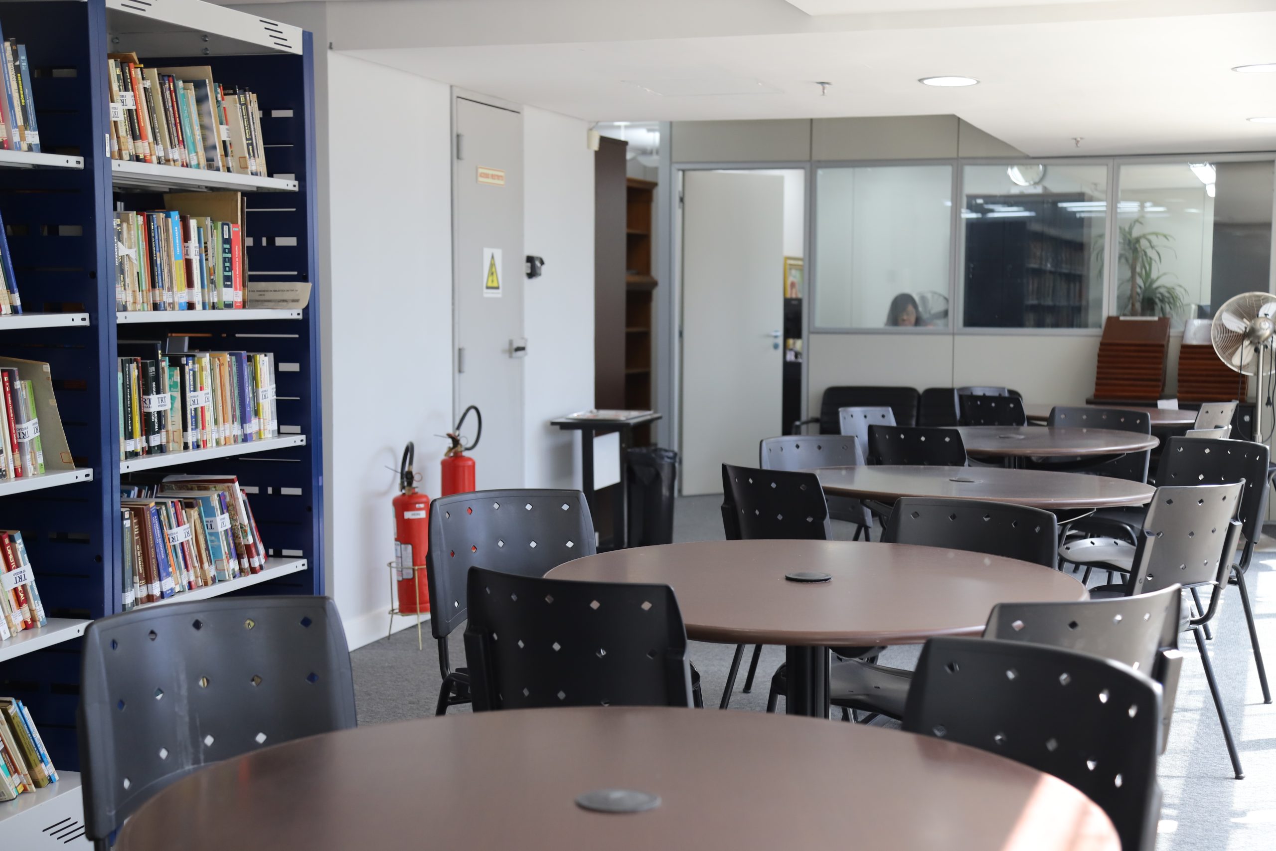 A imagem mostra uma biblioteca ou sala de estudos bem iluminada e espaçosa. Há várias mesas redondas com cadeiras pretas ao redor, prontas para os usuários. Uma estante de livros cheia se destaca em primeiro plano à esquerda, e no fundo há uma janela de vidro que revela outra sala com uma pessoa sentada. A cena transmite um ambiente tranquilo para leitura ou estudo.A biblioteca do Tribunal Regional do Trabalho da 18ª Região reabriu nesta segunda, 26/2. Agora, com piso novo (carpete) e isolamento acústico, a biblioteca já está adequada para receber o público. Localizada no 1º andar do Fórum Trabalhista, a biblioteca funciona das 8h às 16h, de segunda a sexta.