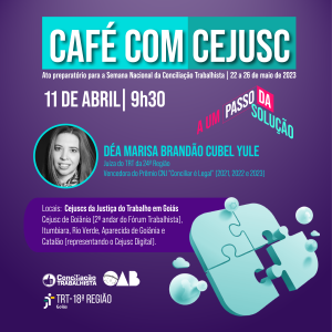 Se você é advogado, advogada, estudante de direito ou possui um processo na Justiça do Trabalho e tem interesse em bater um papo sobre conciliação, esse café é pra você. O Tribunal Regional do Trabalho da 18ª Região (GO) e a Ordem Advogados de Goiás (OAB-GO) vão reunir a advocacia de todo o estado para uma palestra transmitida ao vivo nos Centros Judiciários de Métodos Consensuais de Solução de Disputas (Cejuscs) da Justiça do Trabalho goiana com a juíza Déa Marisa Yule, do TRT da 24ª Região (MS), vencedora de vários prêmios na área de conciliação. O “Café com Cejusc” será realizado no dia 11 de abril a partir das 9h30.