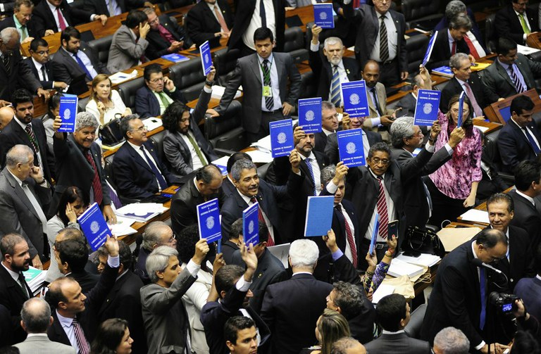Antes da votação, deputados que criticam o projeto de lei fizeram um protesto ao erguerem a carteira de trabalho, em referência à precarização dos direitos trabalhistas.