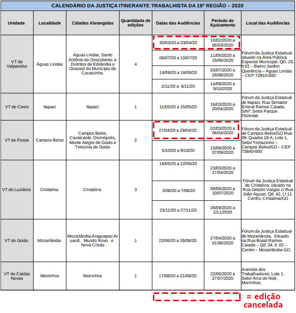 Outro fator que contribuiu para o cancelamento das audiências das edições foi o de que o TRT-18 utiliza instalações da Justiça Estadual para realizar as audiências e o atendimento ao público nos fóruns estaduais está suspenso temporariamente por decisão do Tribunal de Justiça de Goiás. As Varas do Trabalho de Valparaíso de Goiás e de Posse cientificarão as partes e procuradores acerca do cancelamento.