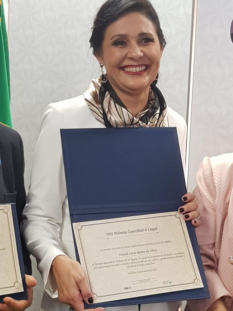 A juíza Wanda Lúcia Ramos, titular da 7ª Vara do Trabalho de Goiânia e coordenadora pedagógica da Escola Judicial do TRT18, também participou do evento. Ela recebeu menção honrosa na categoria Instrutores em Mediação e Conciliação do Prêmio Conciliar é Legal. A homenagem se deve à atuação da magistrada no curso de Capacitação de Conciliadores e Mediadores Judiciais do Regional goiano.