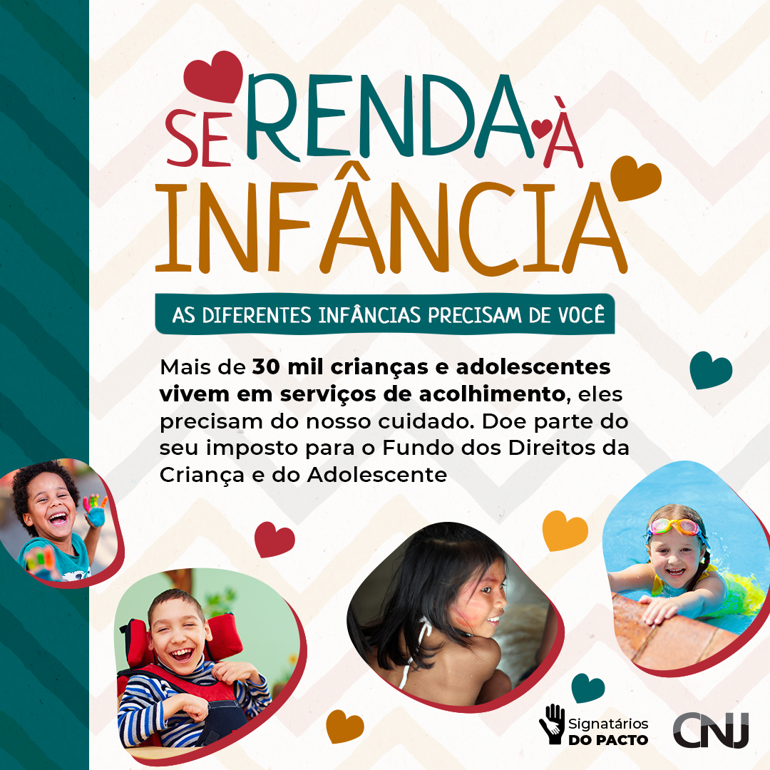 Imagem com os dizeres "as diferentes infâncias precisam de você", "mais de 30 mil crianças e adolescentes vivem em serviços de acolhimento, eles precisam do nosso cuidado. Doe parte do seu imposto para o Funco dos Direitos da Criança e do Adolescente"A campanha “Se renda à infância” foi criada no ano de 2021 com o objetivo de promover a destinação de parte do recurso da declaração do Imposto de Renda à realização de programas e projetos de promoção dos direitos das crianças e adolescentes. A campanha do Conselho Nacional de Justiça (CNJ) busca, neste ano, trazer foco e dar voz às diversas infâncias presentes no Brasil: indígenas, negras, com deficiência e de povos e comunidades tradicionais, por exemplo.