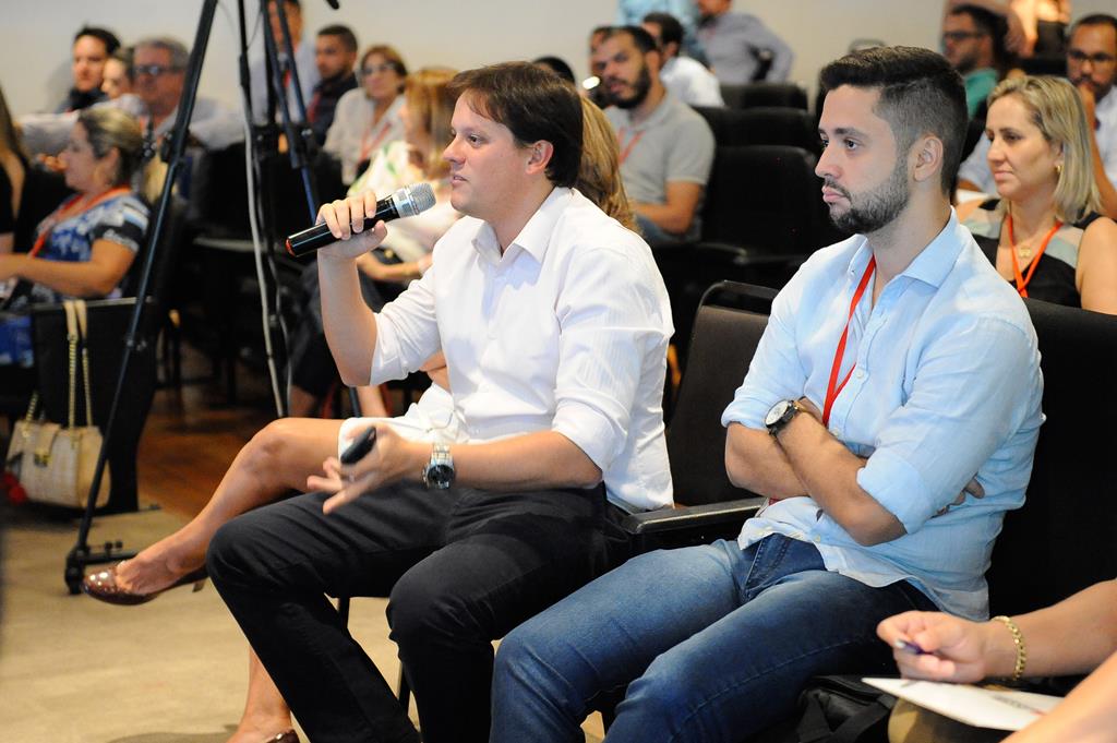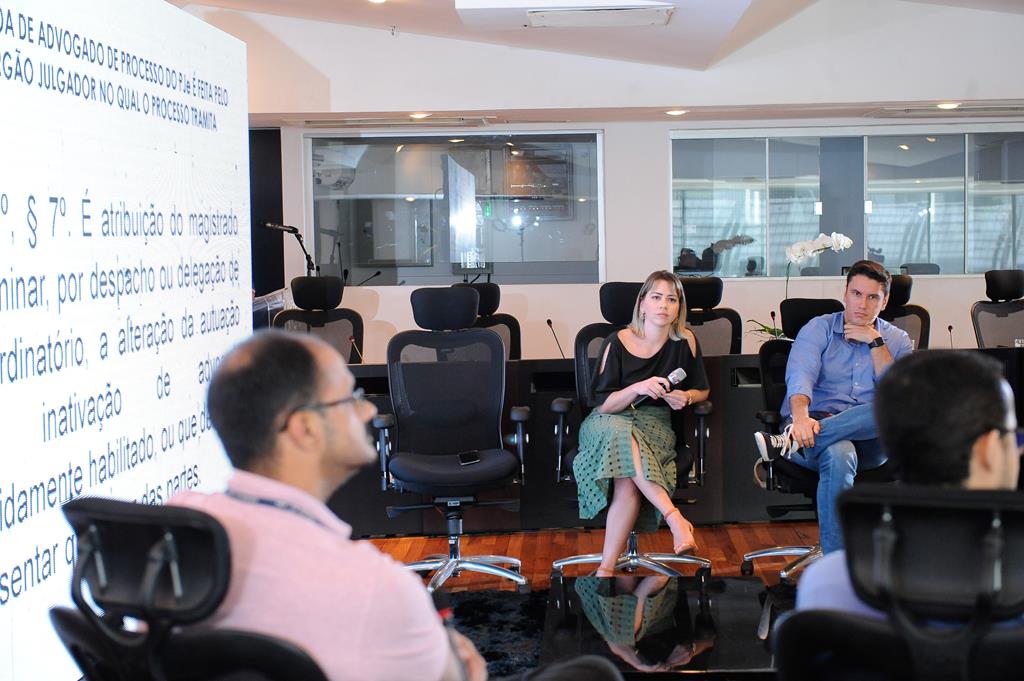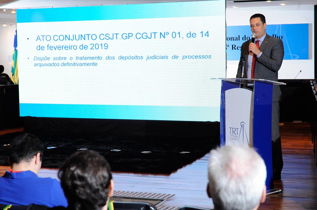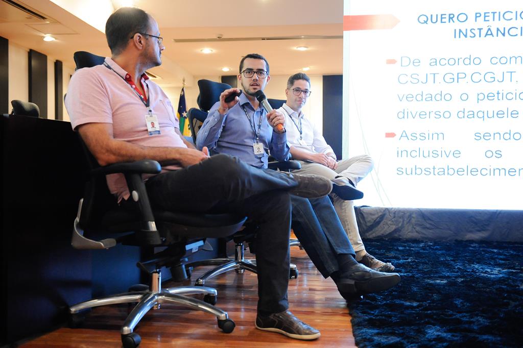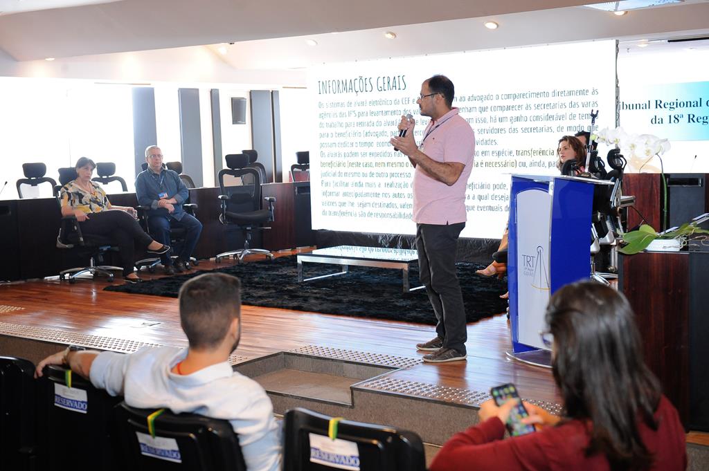 Os servidores Marcelo Marques, diretor de secretaria da Corregedoria Regional do TRT-18, e Cléber Pires, secretário-geral judiciário, abriram a sessão de palestras falando sobre o “Projeto Garimpo”, que, nascido de uma experiência exitosa do TRT do Rio Grande do Norte, dispõe sobre o tratamento dos valores judiciais em processos arquivados definitivamente. Na oportunidade, os advogados fizeram perguntas aos palestrantes sobre como funcionaria, na prática, a liberação desses valores que porventura constem de processos arquivados.