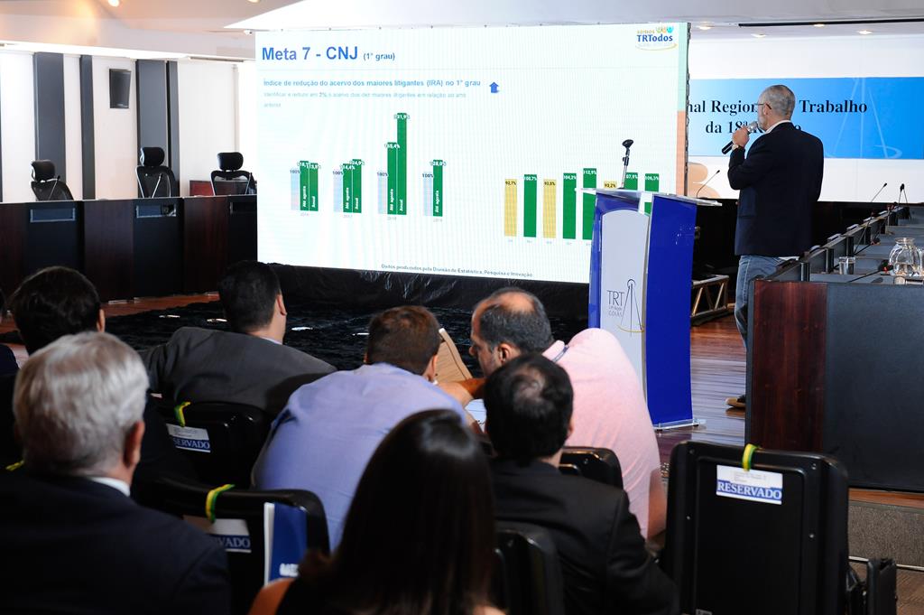 O desembargador Paulo Pimenta falou sobre as metas do Poder Judiciário, destacando a importância de uma gestão participativa para que elas sejam alcançadas. O desembargador apresentou, por meio de uma comparação histórica, dados do relatório Justiça em Números e frisou o excelente desempenho do Tribunal que até agosto já cumpriu 8 das 10 metas estabelecidas para 2019 pelo Conselho Nacional de Justiça (CNJ).