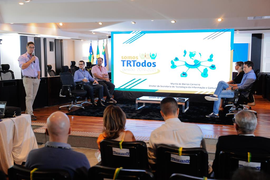 Perto do encerramento, a programação do TRT para Todos – edição especial para advogados – contou com um painel para esclarecimento de dúvidas sobre o PJe. Participaram o diretor da STI, Murilo de Barros, o secretário-geral Judiciário Cleber Pires, o servidor da Gerência de Atendimento ao Usuário do PJe, Hugo Pires, e o advogado José Humberto Meireles, na condição de moderador.