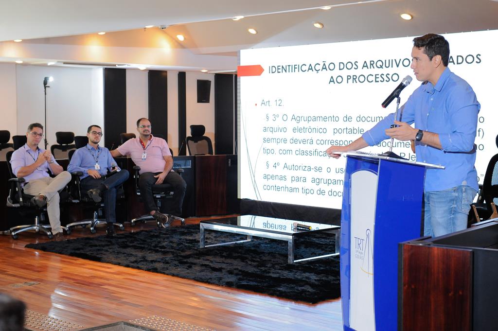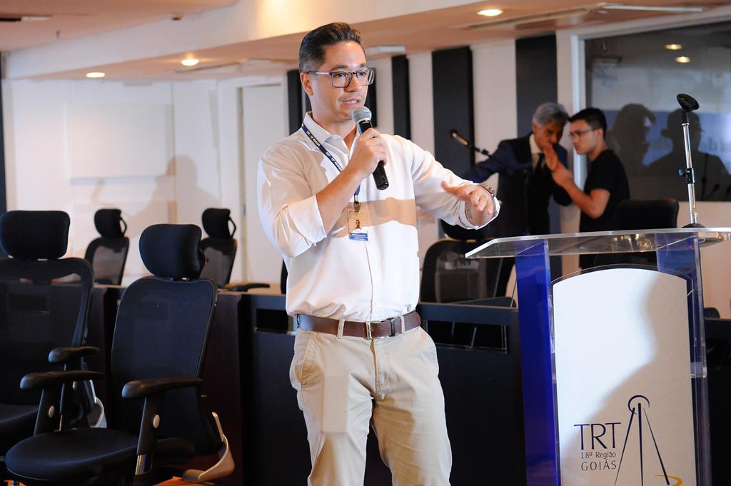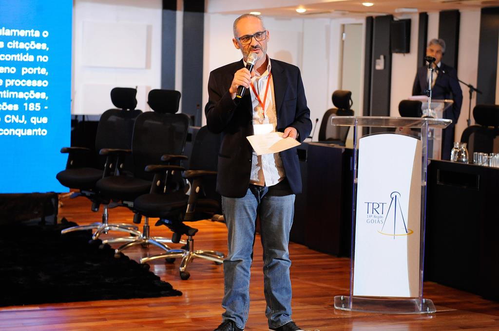 A intimação eletrônica via PJe foi o tema central da exposição seguinte, feita pelo secretário-geral Judiciário, Cleber Pires. Ele chamou a atenção para a Portaria TRT 18ª GP/SGJ nº 2745/2019, assinada naquele mesmo dia (13/9) pelo desembargador-presidente Paulo Pimenta. O documento trata da implantação, no âmbito da 18ª Região, da expedição de comunicações eletrônicas destinadas às entidades públicas e privadas.