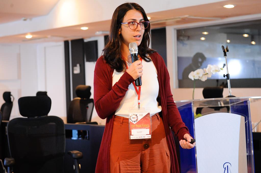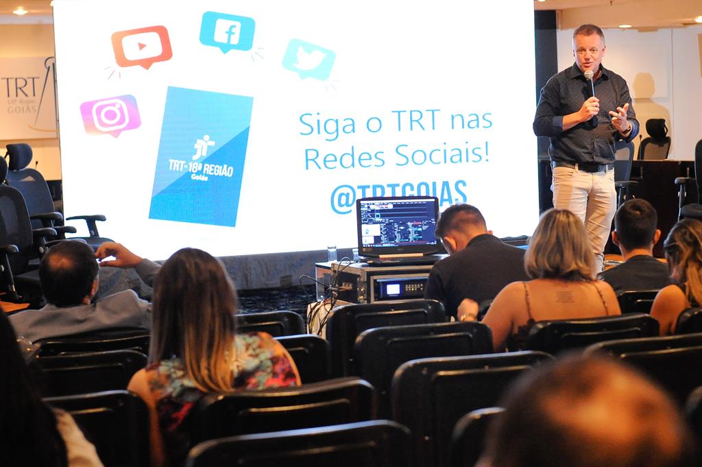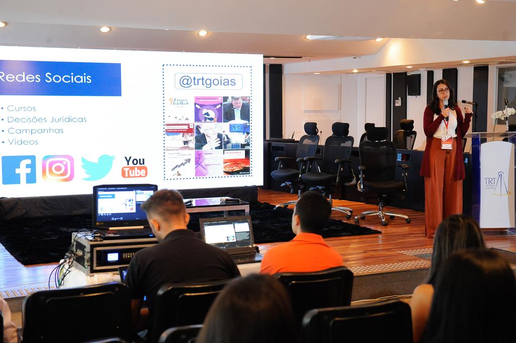 Encerrando o ciclo de palestras do turno da manhã, Lídia Barros, coordenadora da Comunicação Social do TRT-18, apresentou as principais ferramentas disponibilizadas aos advogados e jurisdicionados, tais como o Informativo TRT Goiás, Redes Sociais, Informativo de Precedentes, dentre outras. Lídia Barros também exibiu o layout da nova página do Portal TRT-18, de acordo com a padronização determinada pelo CSJT, destacando que o objetivo foi o fortalecimento da imagem da Justiça do Trabalho.