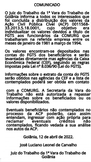 O Juízo da 1ª Vara do Trabalho de Goiânia determinou o pagamento de cerca de R$ 14,8 milhões a cerca de 2,6 mil trabalhadores da Companhia de Urbanização de Goiânia (Comurg) pondo fim a uma Ação Civil Pública que tramitava há mais de oito anos. Os valores devidos são a título de FGTS em benefício dos empregados que trabalharam na empresa entre janeiro de 1981 a março de 1994.