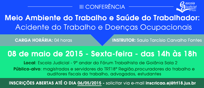 A Escola Judicial do TRT da 18ª Região promove a III Conferência da Pós-graduação em “Tutela do Meio Ambiente do Trabalho e Saúde do Trabalhador”, centrada na temática dos Acidentes do Trabalho e Doenças Ocupacionais, que será proferida pelo Juiz do Trabalho do TRT da 16ª Região Dr. Saulo Tarcísio de Carvalho Fontes nas dependências da Escola Judicial, no 9º andar do Fórum Trabalhista de Goiânia.
