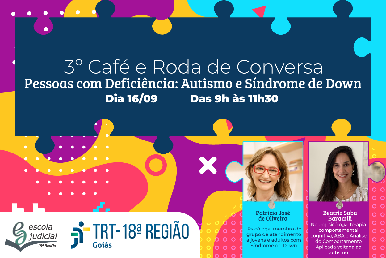 A Escola Judicial do TRT-18 (Ejud-18) vai realizar o “Terceiro Café e Roda de Conversa – Pessoas com deficiência: autismo e síndrome de Down” no dia 16 de setembro, das 9h às 11h30. O evento é aberto ao público em geral e ocorre presencialmente no Espaço Congadas, localizado no Fórum Trabalhista de Goiânia.