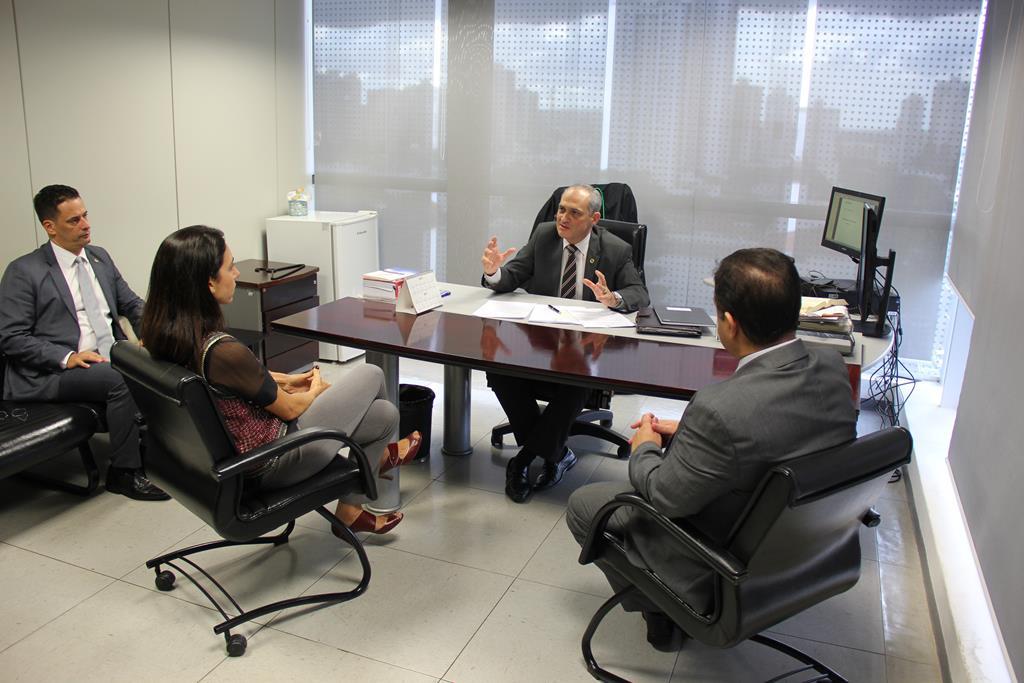 Desembargador-corregedor Paulo Pimenta e o diretor da Corregedoria Regional, Marcelo Marques, em conversa com os juízes Luiz Eduardo Paraguassu e Sara Lúcia
