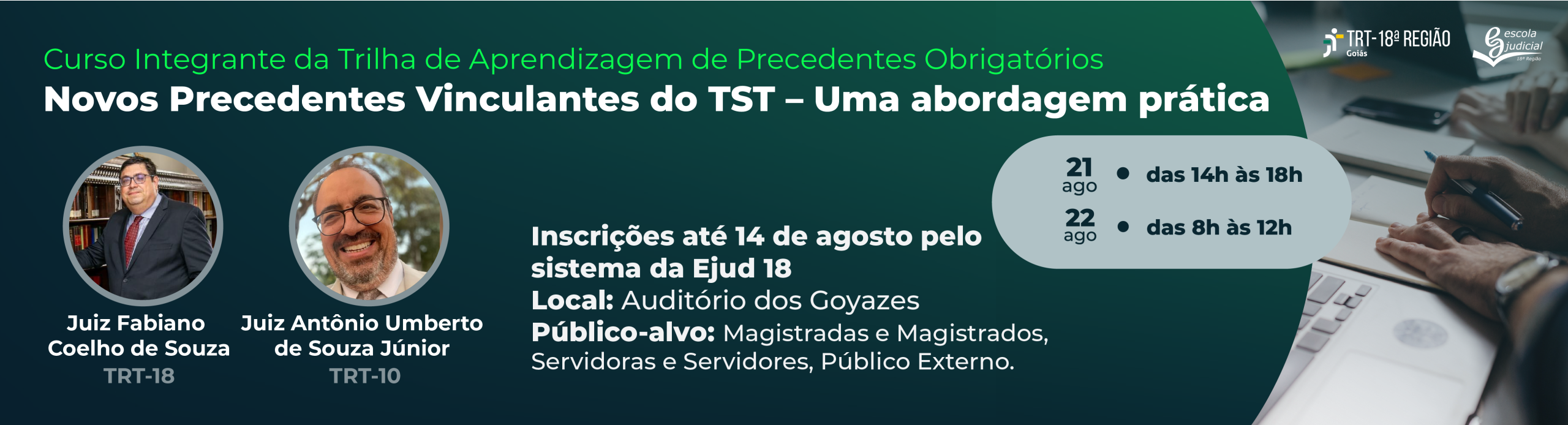 A Escola Judicial do TRT da 18ª Região (Ejud18) realizará, nos dias 21 e 22 de agosto, o curso sobre os “Novos Precedentes Vinculantes do TST – Uma Abordagem Prática”, no Auditório dos Goyazes, de forma presencial e com transmissão ao vivo pelo YouTube. O evento é destinado a magistrados, servidores e ao público externo, com vagas limitadas: 100 para magistrados, 350 para servidores e 50 para advogados trabalhistas.