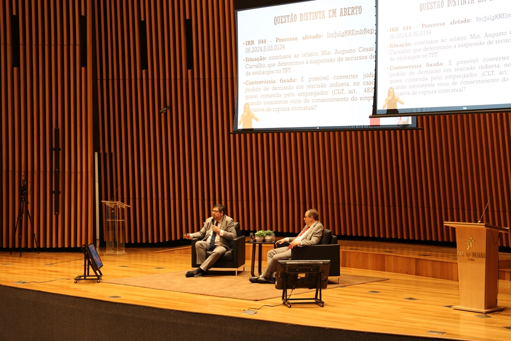 Os expositores foram os juízes Fabiano Coelho de Souza, do TRT-GO, e Antônio Umberto de Souza Júnior, do TRT da 10ª Região (DF/TO). Ambos enfatizaram que a adoção de precedentes vinculantes representa uma mudança estrutural no modo de atuação de advogados, magistrados e membros do Ministério Público.