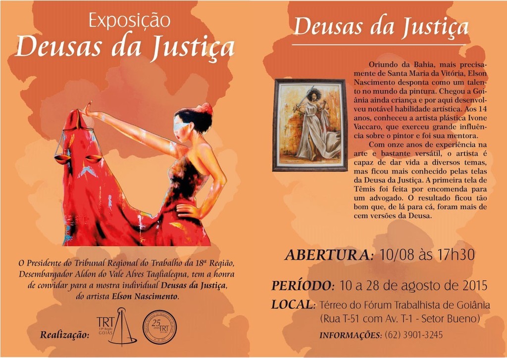 Desde que começou a criar em 2009 diferentes versões da Deusa Têmis, que simboliza a Justiça, o artista plástico Elson Nascimento encantou os profissionais de carreira jurídica. Já foram mais de 100 pinturas, a maioria em óleo sobre tela, criadas pelo artista e que fizeram parte de várias exposições no país. Elas são fortes, sensuais, femininas, belas, justas… Há a Têmis negra, a dançarina, e outras 18 versões que farão parte da mostra na Justiça do Trabalho que será inaugurada no dia 10 de agosto, às 17h30, no andar térreo do Fórum Trabalhista de Goiânia.