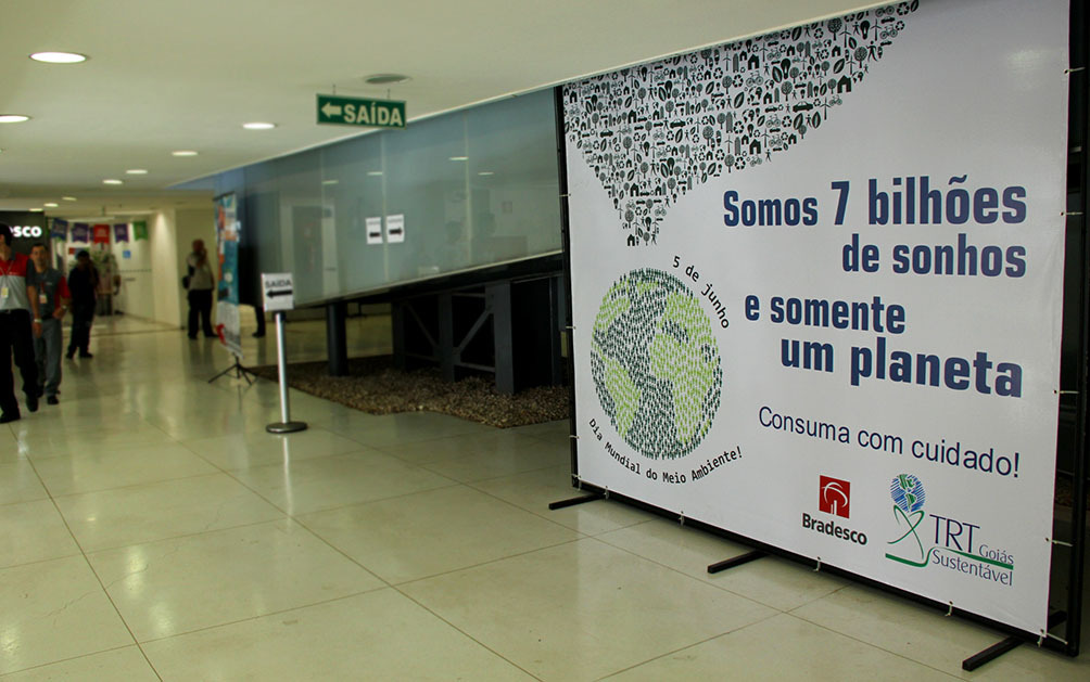 O TRT Goiás, por meio do seu Setor de Responsabilidade Socioambiental, abraçou essa ideia e, além do conjunto de ações sustentáveis geridas por meio do Plano de Logística Sustentável, produziu um banner em parceria com o Núcleo de Comunicação Social, instalado na entrada do Fórum Trabalhista de Goiânia com o propósito de convidar as pessoas a refletirem sobre o consumo consciente.