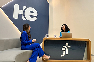 Uma mulher sentada em uma poltrona e um mulher numa bancada. Elas olham para a câmara. Ao fundo, a logomarca do programa hora extra. Embaixo da bancada, a logomarca da Justiça do Trabalho