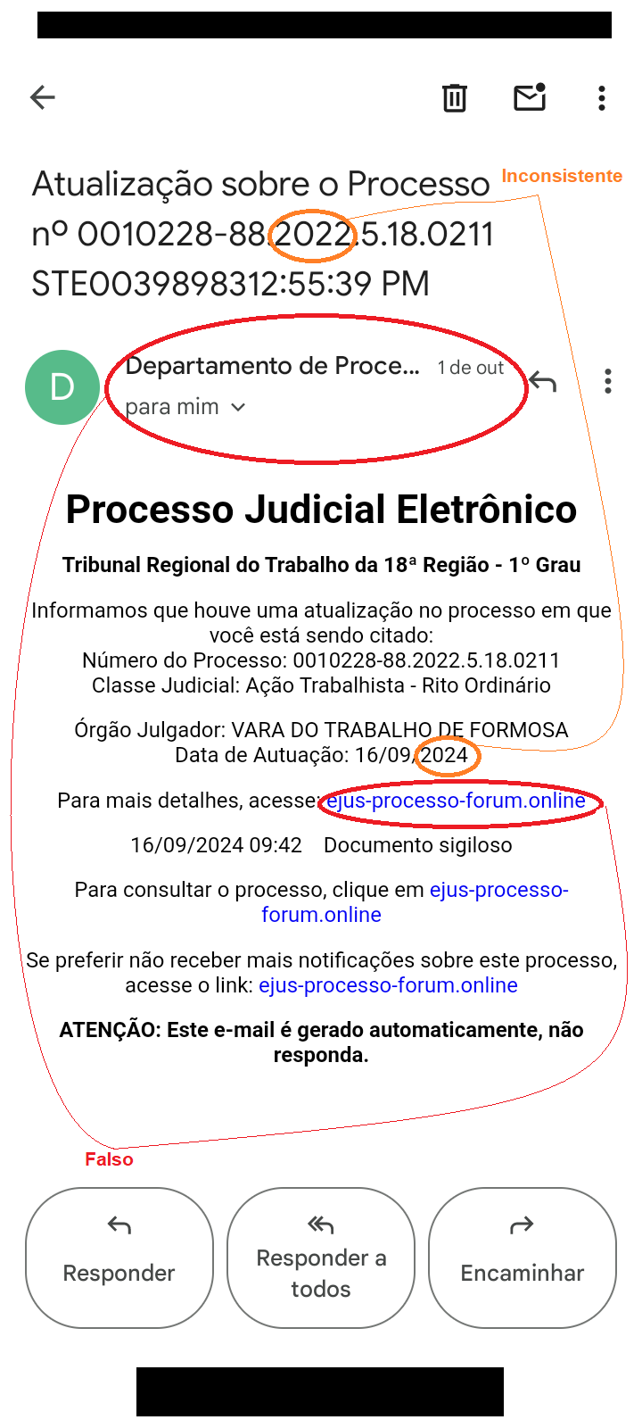 Exemplo de mensagem falsa enviada por e-mail. Uma das inconsistências apontadas diz respeito ao ano de autuação do processo. Acima aparece 2022 no número do processo e abaixo, 2024