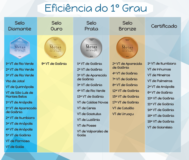 A premiação, que foi instituída pelo próprio TRT18 há um ano, contemplará as unidades nas categorias Diamante, Ouro, Prata e Bronze. O reconhecimento da eficiência do primeiro grau de jurisdição visa a incentivar o aprimoramento e a melhoria da qualidade da prestação de serviços aos usuários da Justiça do Trabalho