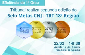 O Tribunal Regional do Trabalho da 18ª Região (Goiás) realiza nesta sexta-feira (22/2) a segunda edição do Selo Metas CNJ. O evento acontece no auditório do Fórum Trabalhista às 14h30 e premiará as varas do trabalho goianas que tiveram bom desempenho no cumprimento das Metas do Conselho Nacional de Justiça (CNJ) em 2018. As unidades que se destacaram no alcance das metas receberão troféus e certificados do “Selo Metas CNJ 2018 – TRT 18ª Região”.
