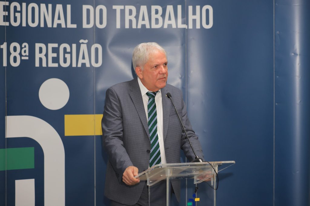 A imagem mostra um homem de meia-idade, vestido com um terno preto e sem gravata, falando em um púlpito de acrílico transparente. Ele está em frente a um painel azul que exibe as palavras "TRIBUNAL REGIONAL DO TRABALHO 18ª REGIÃO". A expressão do homem é séria e focada, indicando que ele está fazendo um discurso ou uma apresentação em um contexto oficial relacionado ao tribunal.
