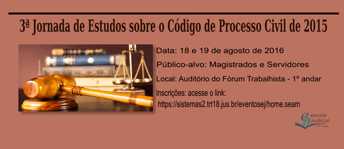 As inscrições podem ser feitas até o dia 15/8, pelo endereço https://sistemas2.trt18.jus.br/eventosej/home.seam ou acessando a aba da Escola Judicial no site do TRT18. A 3ª Jornada sobre o Novo Código de Processo Civil tem carga horária de 12 horas e faz parte do Plano Anual de Capacitação da Escola Judicial do TRT18. A 1ª e a 2ª edições da Jornada aconteceram, respectivamente, nos dias 25 e 26 de junho de 2015 e 19 e 20 de maio deste ano.