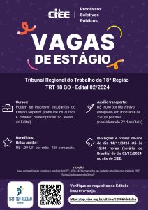 A Secretaria de Gestão de Pessoas informa que as inscrições do processo seletivo de estágio no TRT-GO estão abertas até o dia 2 de dezembro (segunda-feira). Para realizar a inscrição basta acessar o portal do CIEE, seguindo o caminho: Home CIEE>Processos Seletivos>Detalhes do processo.