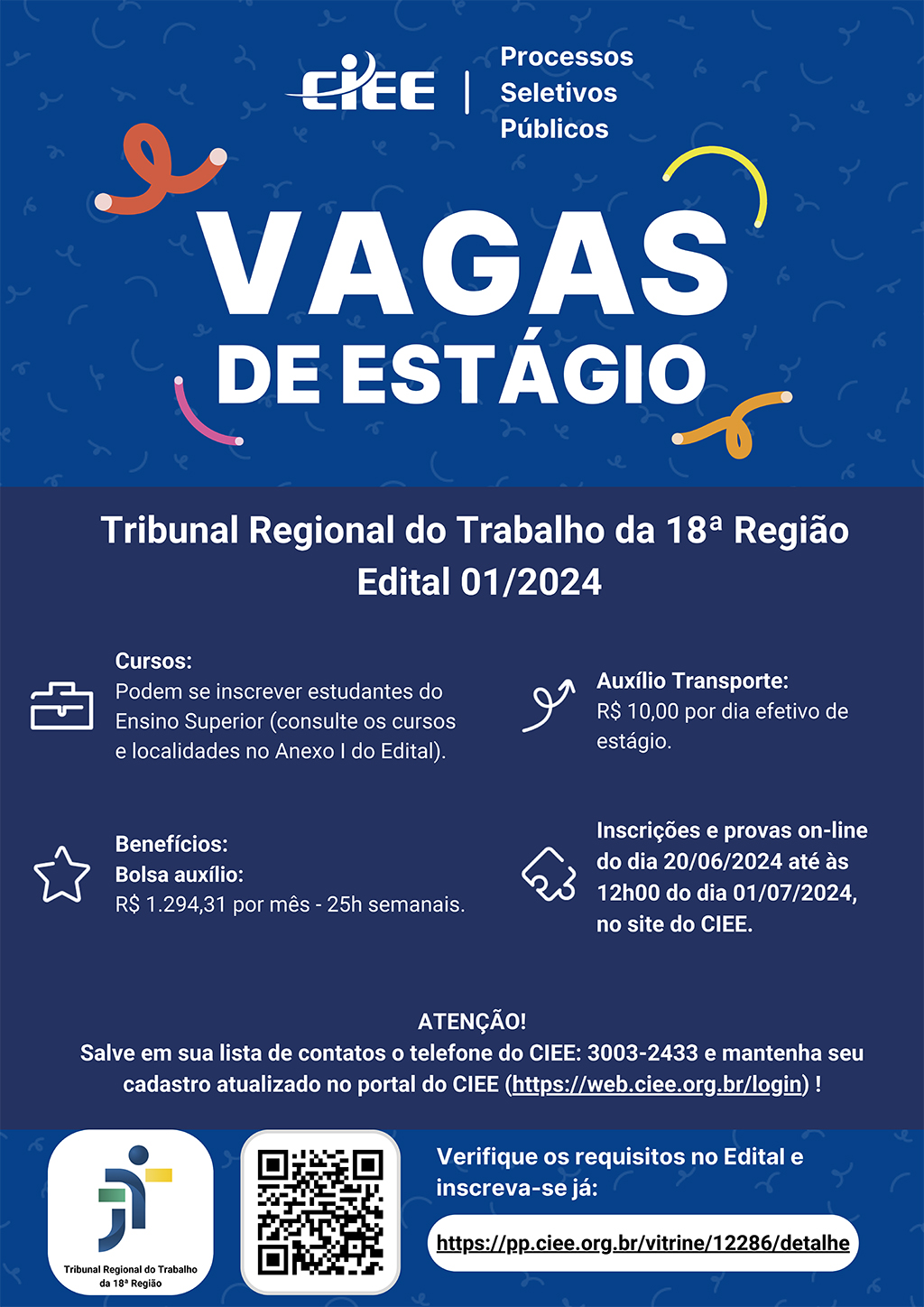 É importante que o candidato salve em sua lista de contatos o telefone do CIEE: 3003-2433 e mantenha seu cadastro atualizado no portal do CIEE.