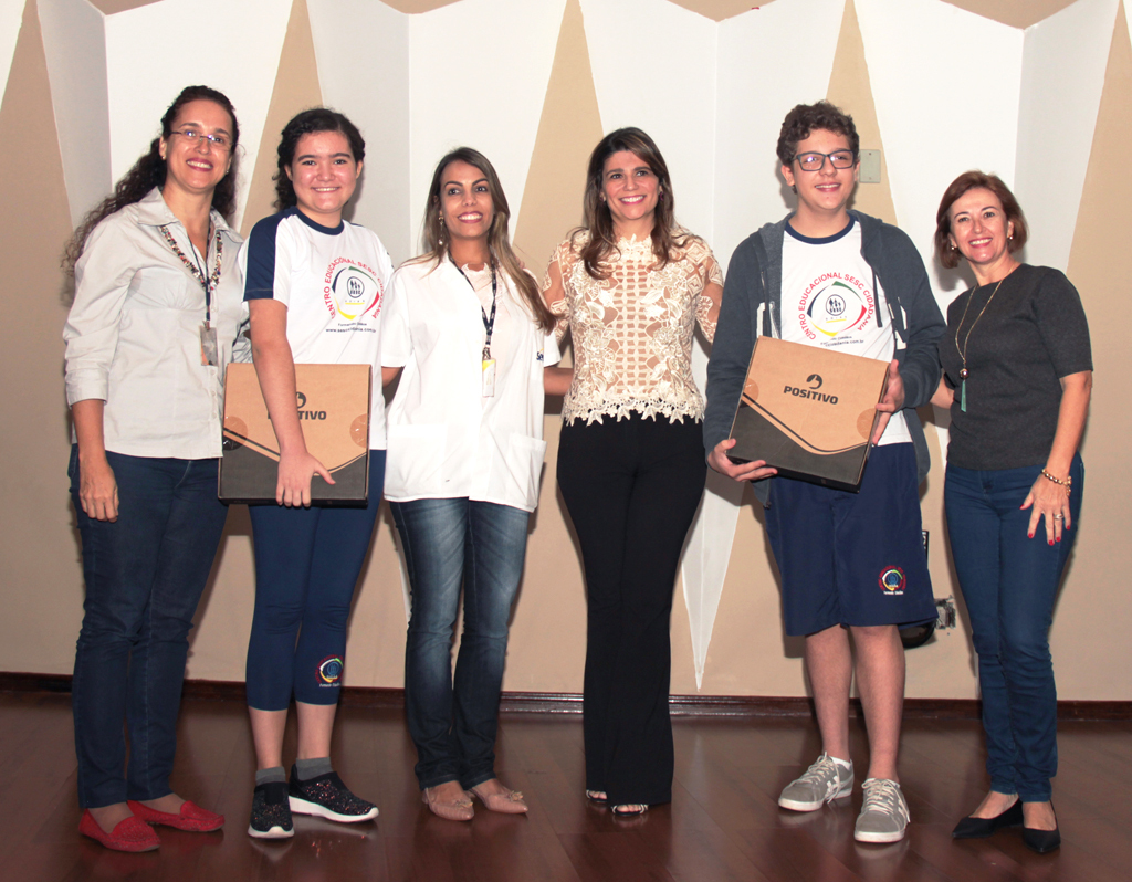 Desembargadora Iara Rios com a diretora do Sesc Cidadania, Filomena Seabra, as professoras de português e os vencedores do concurso