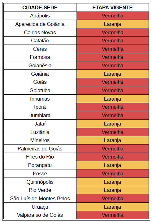 As mudanças de etapas seguem critérios objetivos definidos no mencionado Protocolo. A progressão à Etapa Laranja ocorre quando os níveis de riscos e correspondentes indicadores epidemiológicos e de capacidade de atendimento hospitalar permanecerem na faixa “MODERADO” por pelo menos 3 semanas consecutivas. Para ingressar na referida etapa, a Região de Saúde não pode estar classificada em situação de “Calamidade” e seu valor de Re (Velocidade de contágio no tempo) deve estar em valor inferior a 1,2.