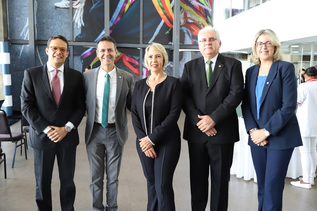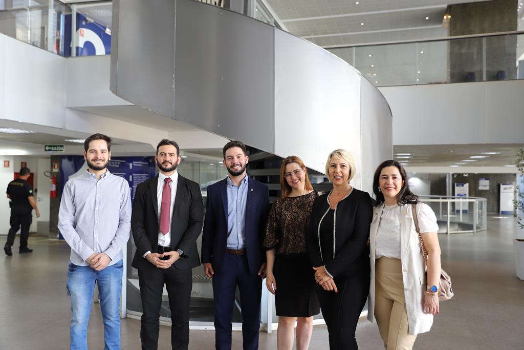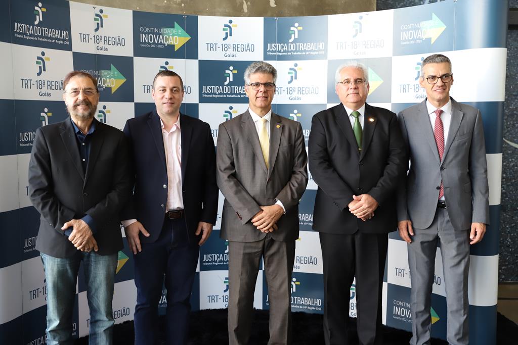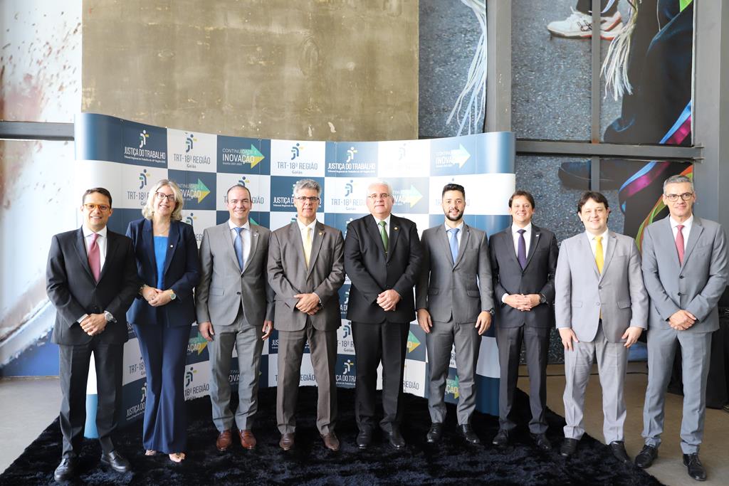 o advogado Jerônimo Batista Júnior, presidente da Agatra; Gustavo Seixas, secretário-geral da presidência do TRT-18; Joelson Lisbôa, presidente da Associação dos Servidores da Justiça Trabalhista de Goiás (Asjustego); Lamartine Moreira, presidente do Crea-GO; Zilma Peixoto, superintendente do CREA-GO; Eduardo Alves, diretor-executivo da AdialLog; Marcio Andrade, presidente do Sindiposto; Leandro Stival, presidente do Sindicarne-GO; Gustavo Oliveira, presidente do IGT; e Halanna Rabelo, representante da São Salvador.