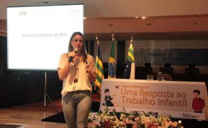 A terceira e última palestra do evento foi ministrada pela psicóloga e servidora estadual Camila Forjado. A gerente de proteção social da Secretaria Cidadã, do governo de Goiás, falou sobre ações estratégicas do Programa de erradicação do trabalho infantil (Peti). Segundo ela, o reordenamento das ações do programa aconteceu em 32 municípios goianos no sentido de articular as políticas de atendimento às crianças e adolescentes em situação de trabalho infantil e suas famílias.