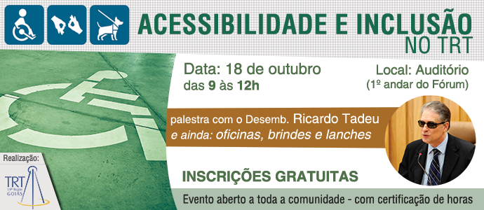 Acessibilidade e inclusão no TRT18 é o tema de um evento que o Setor de Responsabilidade Socioambiental e a Gerência de Saúde do Tribunal promovem no dia 18/10 no auditório do Fórum Trabalhista de Goiânia. O evento tem como objetivos enfatizar os benefícios significativos que a acessibilidade pode trazer tanto para pessoas com deficiência quanto para a sociedade e sensibilizar para a importância da igualdade de oportunidades. Um dos participantes de destaque será o desembargador do TRT da 9ª Região (Paraná) Ricardo Tadeu Marques da Fonseca. Ele é cego e falará sobre “O trabalho da pessoa com deficiência no contexto dos Direitos Humanos”.