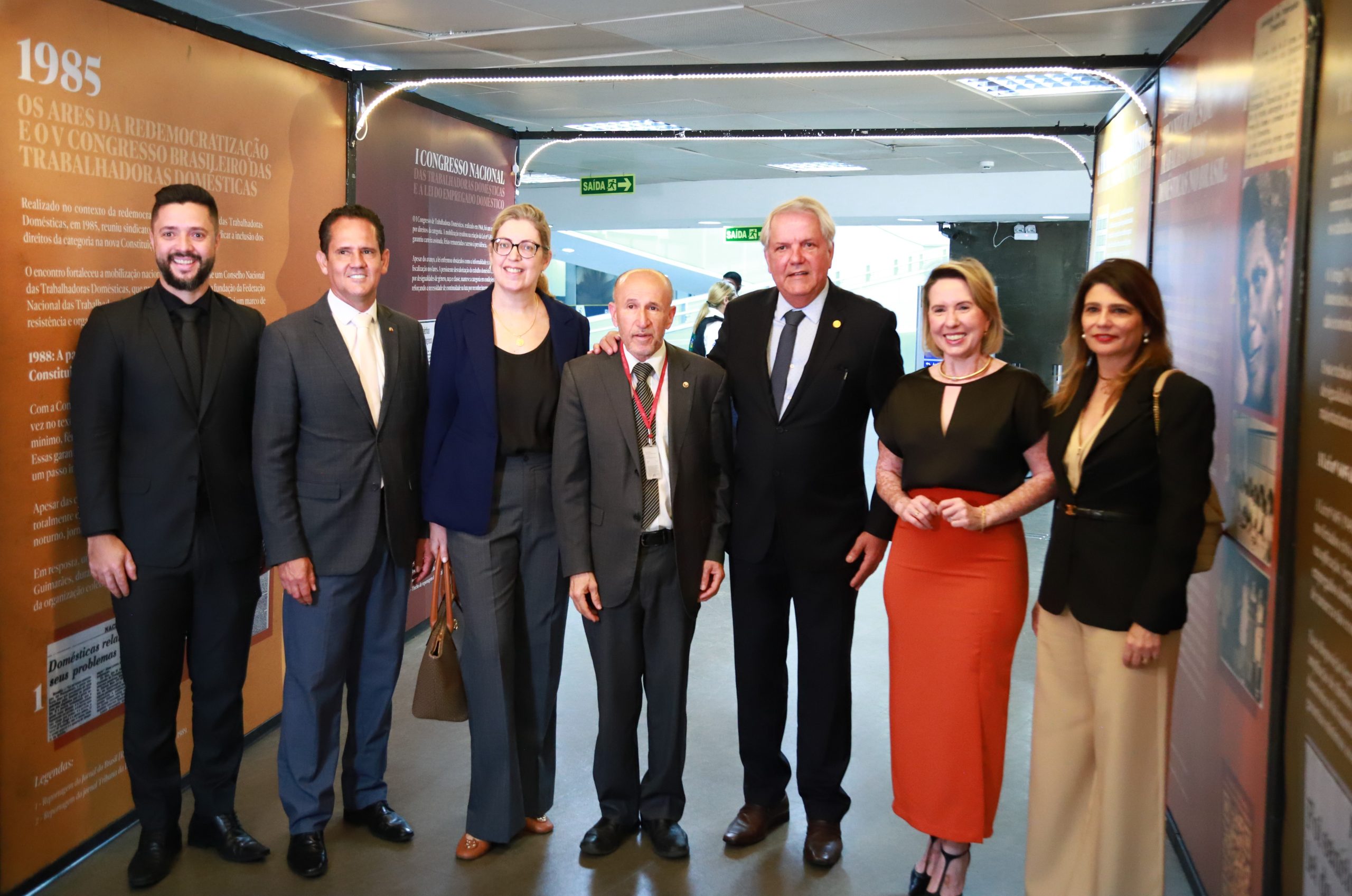 Autoridades na “Travessia histórica”, um túnel do tempo com datas marcantes da luta das domésticas por direitos. Da esquerda para a direita: advogado Jerônimo Batista Jr, juiz Cleidimar Almeida, advogada Arlete Mesquita, procurador do MPT-GO Alpiniano Lopes, desembargador Eugênio Cesário, advogada Cristiane Pavan e desembargadora Iara Rios