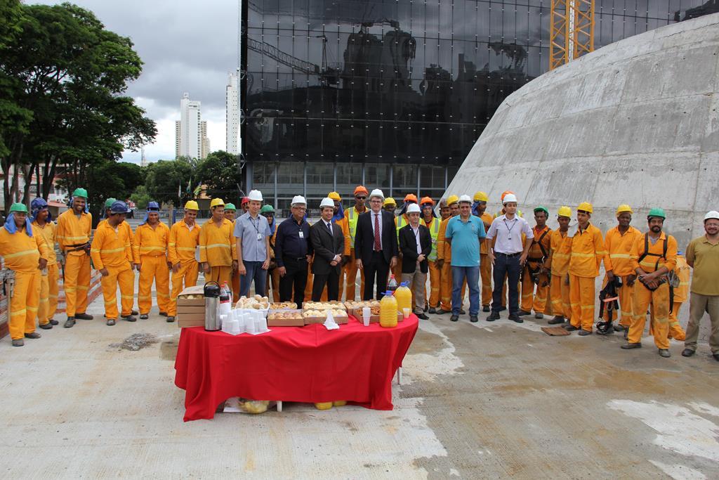 O desembargador-presidente ainda aproveitou a ocasião para comemorar o fato de não ter sido registrado nenhum acidente de trabalho durante a execução das obras. “Temos a grata satisfação de celebrar isso hoje. Peço a Deus que abençoe todos vocês para que as obras continuem sendo tocadas de forma segura. Vocês estão de parabéns”, declarou. No total, 60 operários atuam na construção do Complexo Trabalhista de Goiânia, sob a responsabilidade da empreiteira Concretiza.