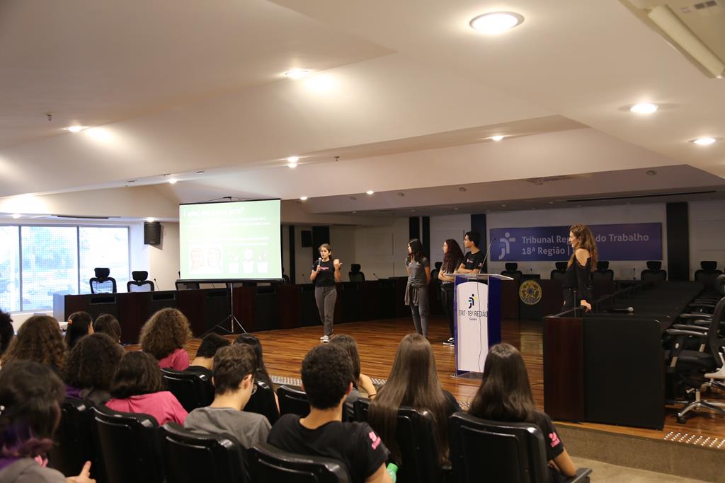 Recebidos pela diretora da Divisão de Sustentabilidade, Acessibilidade e Inclusão do TRT-18, Lara Barros, os alunos assistiram a duas palestras no auditório Villa Boa. Na ocasião, os estudantes assistiram a palestra da diretora sobre o tema “Coleta seletiva e reciclagem no TRT” e, em seguida, aprenderam sobre “Energia fotovoltaica no TRT” em conversa com Paulo Henrique Lima, engenheiro elétrico do tribunal.