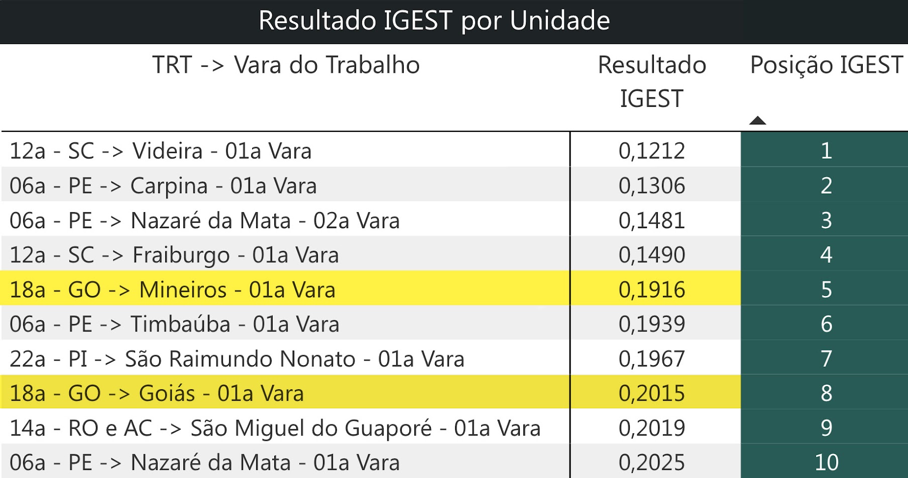 As outras varas que também ficaram no Top 10 nacional do IGest são as Varas do Trabalho de Videira (SC), Carpina (PE), 2ª Vara de Nazaré da Mata (PE), Friburgo (SC), Timbaúba (PE), São Raimundo Nonato (PI), São Miguel do Guaporé (RO) e 1ª Vara de Nazaré da Mata (PE).